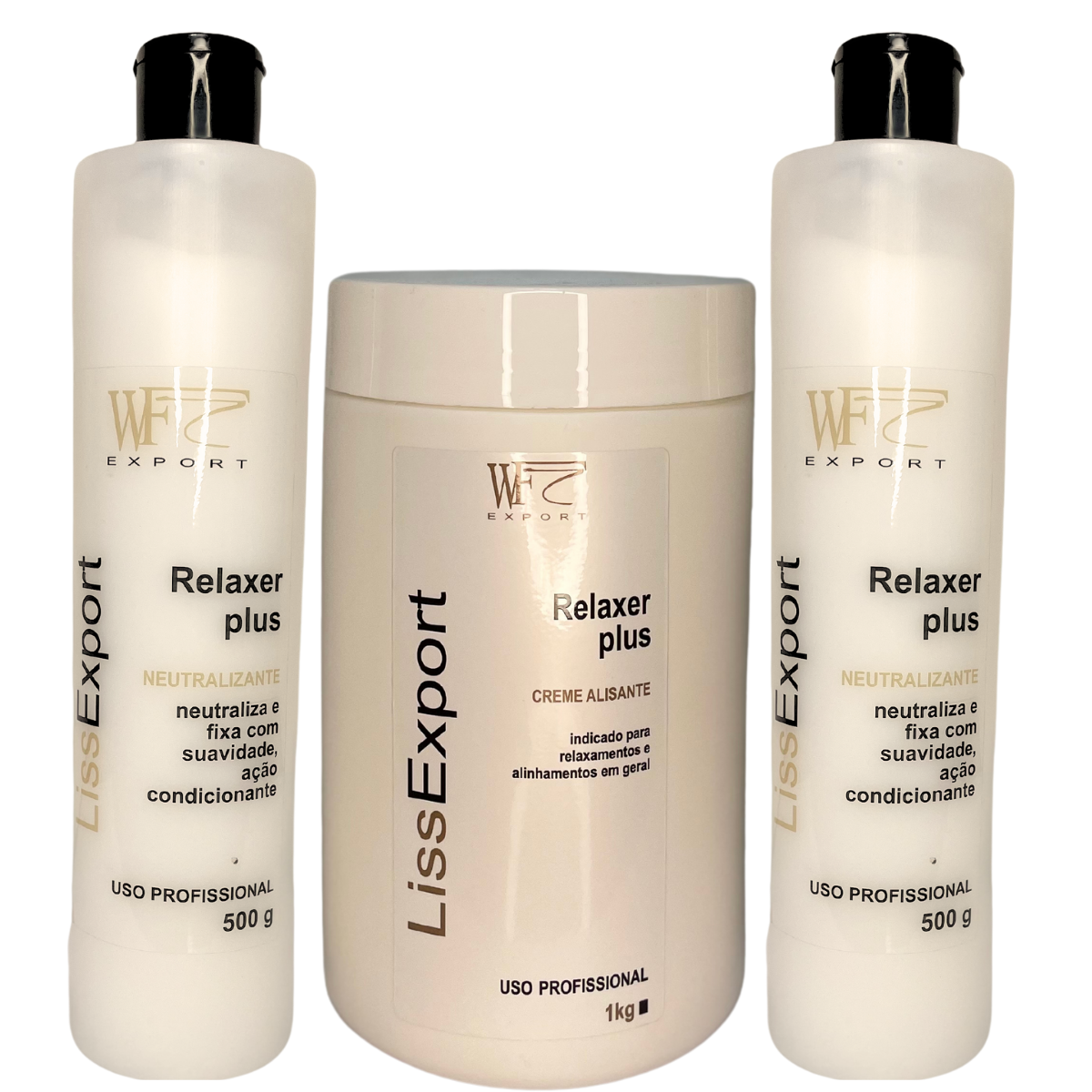 O Kit Liss Export Relaxer Plus Suave WF Cosméticos é composto por 01 creme alisante profissional de 1kg e 02 neutralizantes de 500ml cada, ideal para proporcionar desde a abertura dos cachos até o alisamento total.